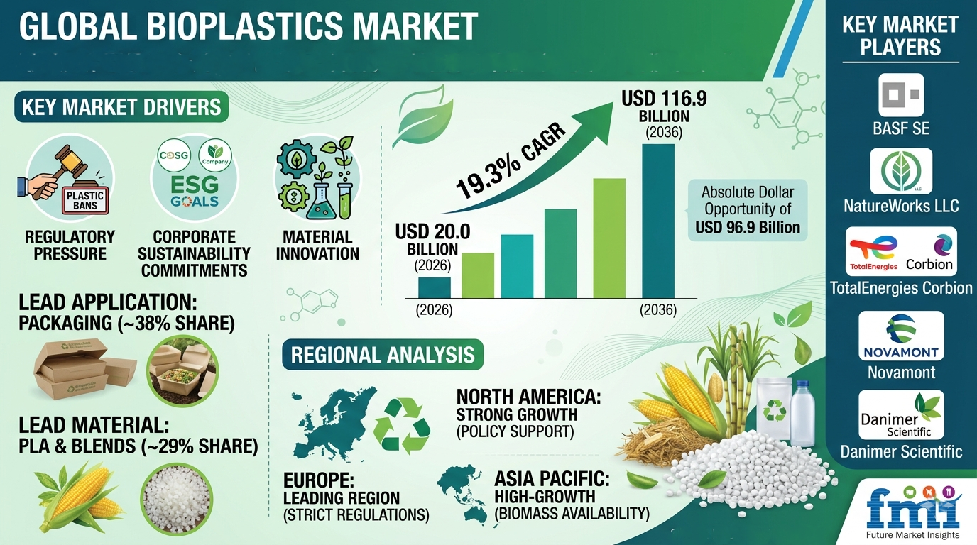 The global bioplastics market is entering a transformative growth phase, driven by regulatory pressure, corporate sustainability commitments, and rapid material innovation. Valued at USD 16.8 billion in 2025, the market is projected to reach USD 20.0 billion in 2026 and an impressive USD 116.9 billion by 2036, expanding at a CAGR of 19.3%. This growth reflects a structural shift from petroleum-based plastics to renewable and biodegradable alternatives across key industries.